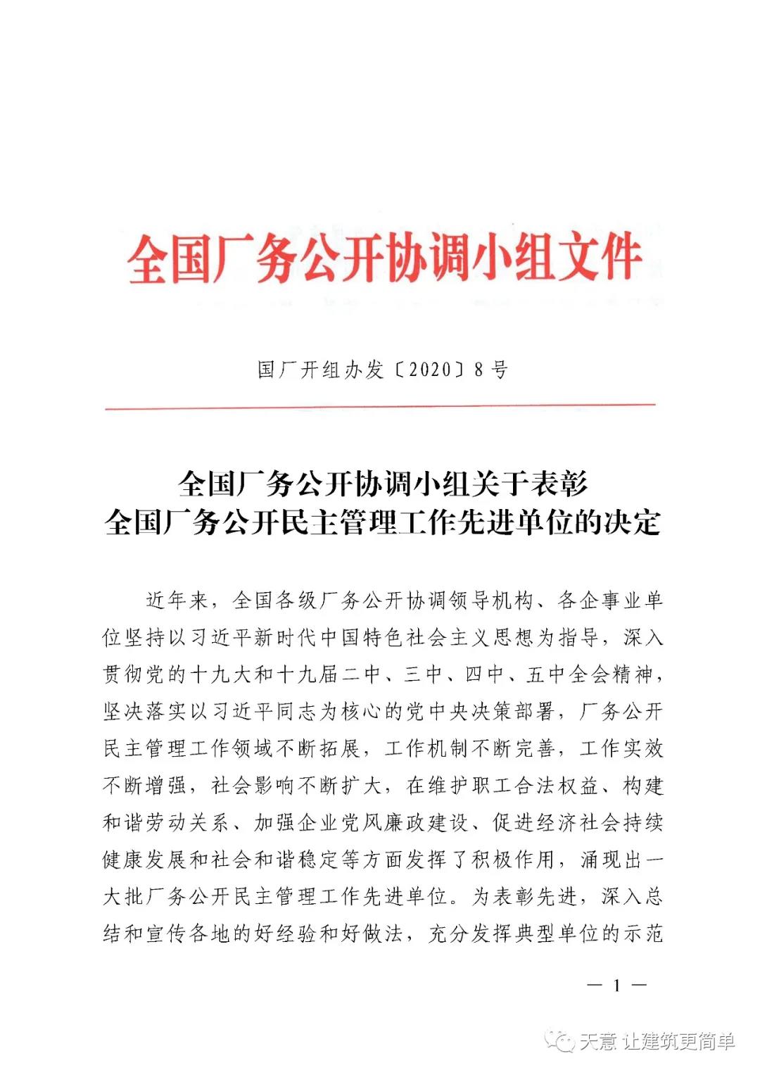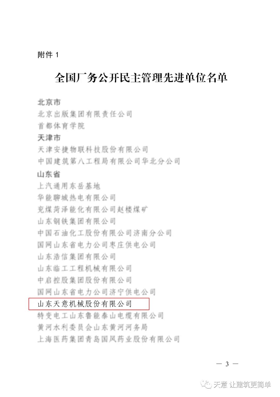 12月11日,從全國(guó)總工會(huì)傳來喜訊,山東天意機(jī)械股份有限公司被授予“全國(guó)廠務(wù)公開民主管理先進(jìn)單位”稱號(hào)。