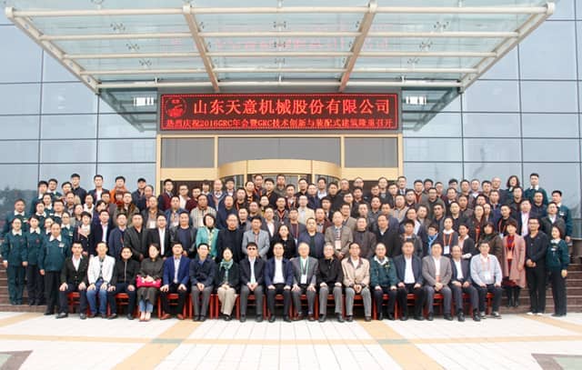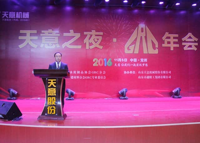 為加快GRC技術創新,積極適應經濟新常態,2016年11月5日,2016 GRC年會暨裝配式建筑發展研討會在山東圣德酒店盛大召開,本次會議由GRC協會及專業委員會主辦,山東天意機械股份有限公司協辦。